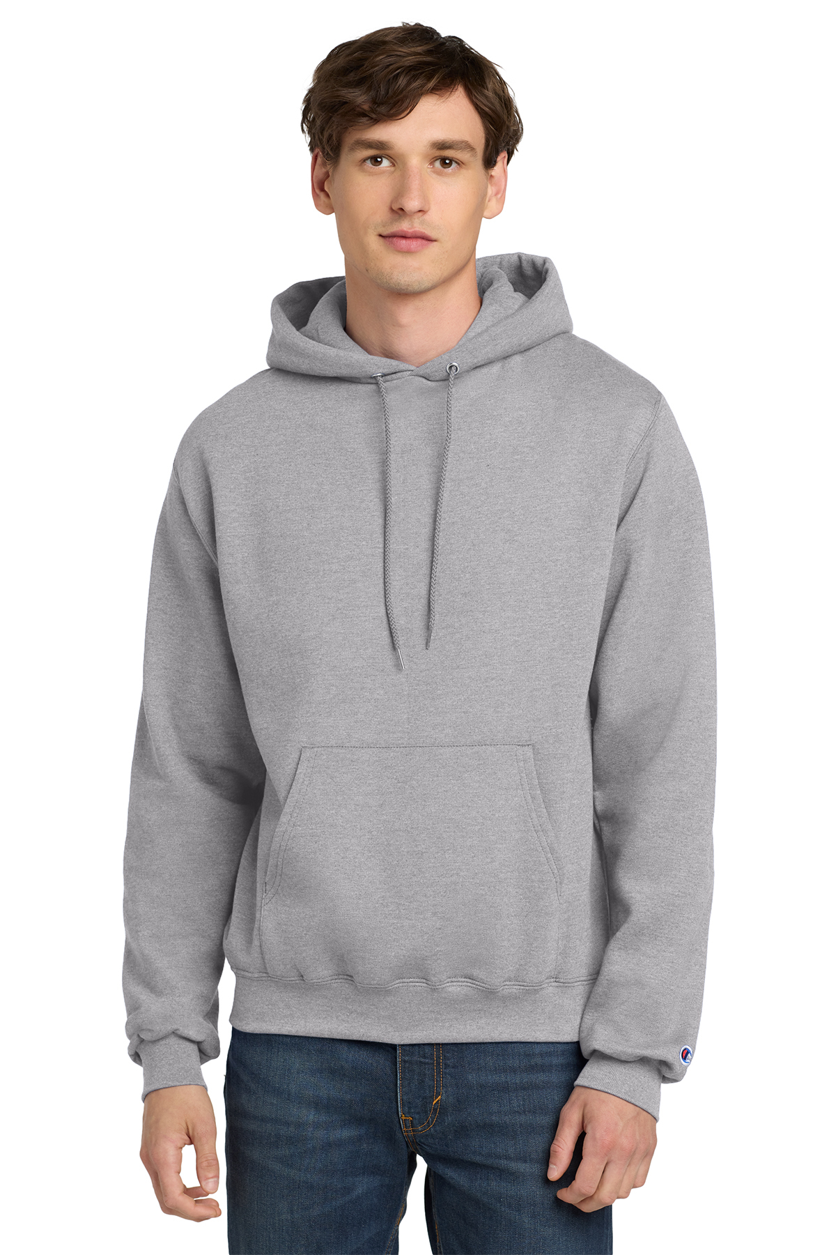 9-ounce, 50/50 cotton/poly 50/40/10 cotton/poly/black poly (Light Steel) 50/49/1 cotton/poly/black poly (Silver Grey) Double Dry technology wicks moisture Two-ply hood with dyed-to-match drawcords 1x1 rib knit sleeve cuffs and hem Front pouch pocket Embroidered Champion “C” logo at left cuff Woven back neck label