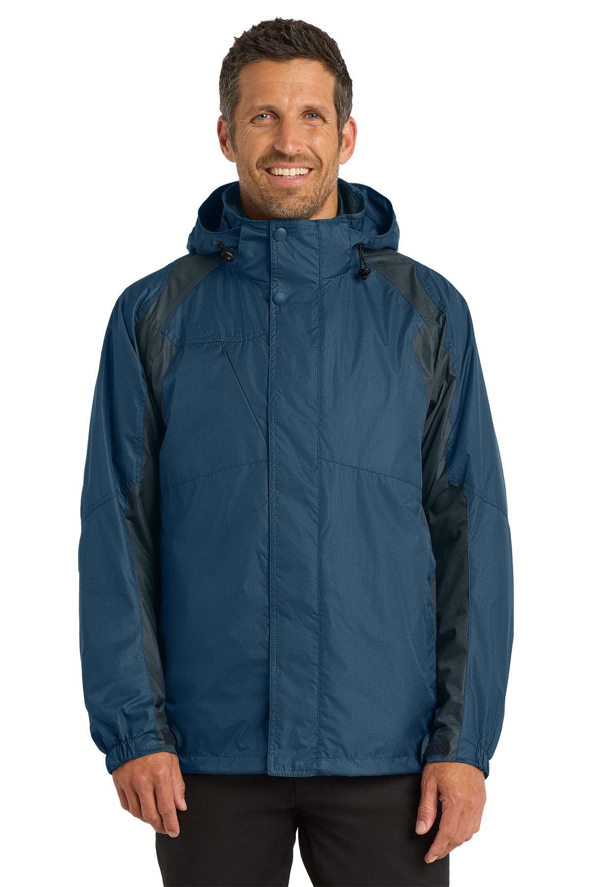 100% polyester shell 100% polyester lining 100% polyester microfleece inner jacket 3000MM fabric waterproof rating 3000G/M² fabric breathability rating Critically seam-sealed for added waterproof protection Detachable hood with adjustable self-fabric tab, drawcord and toggles Full-length Interior storm flap Full-length exterior storm flap with hook and loop and snap closures Two-way Vislon® zipper Angled zippered chest pocket Interior pocket Front zippered pockets Half elastic, half self-fabric adjustable tab cuffs with hook and loop closures Port Pocket™ for decoration access 100% polyester microfleece inner jacket has an anti-pill finish and front zippered pockets Open hem with drawcord and toggles for adjustability